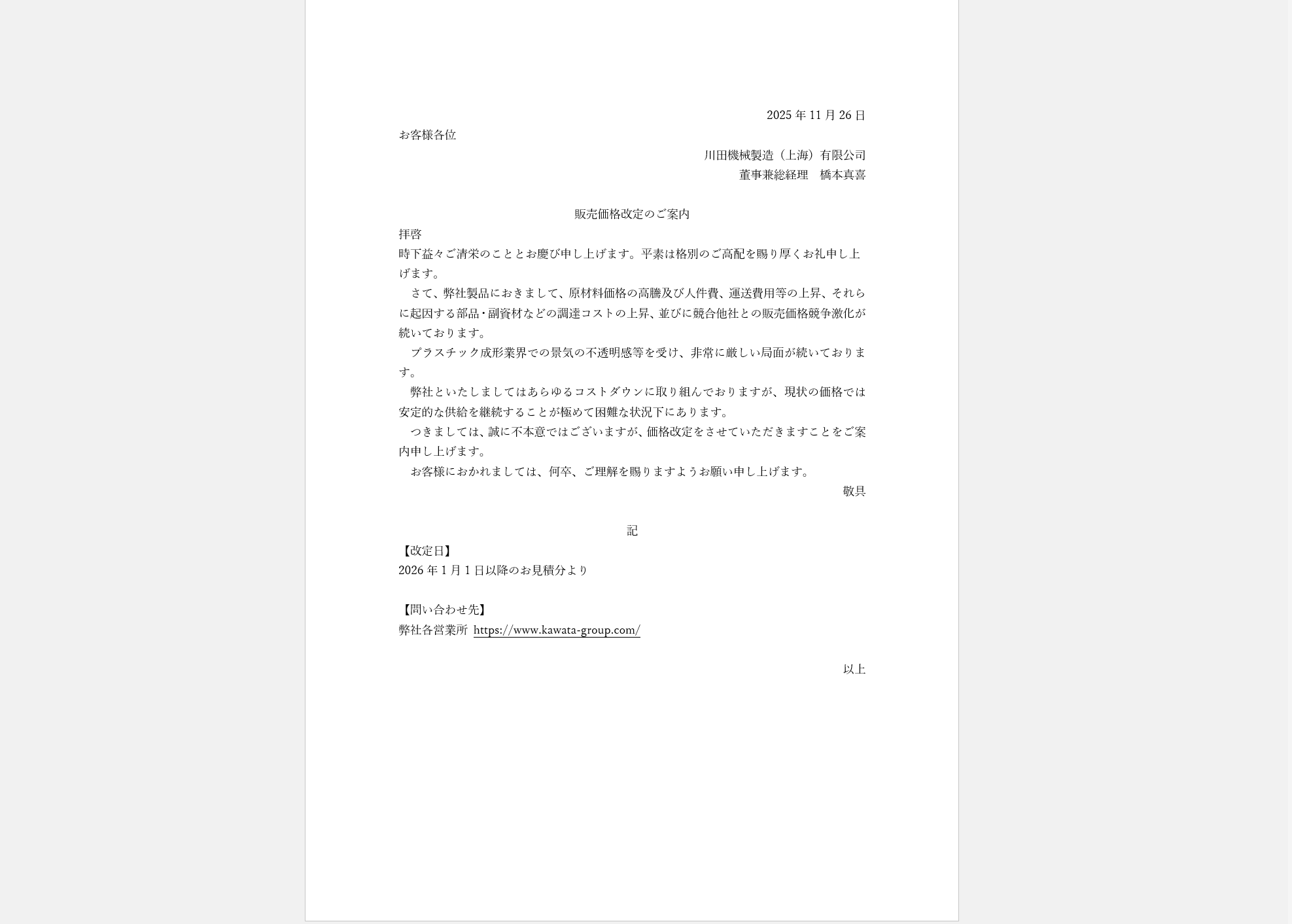販売価格改定のご案内